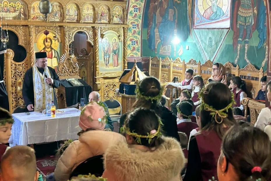 Apoi, într-o atmosferă de sărbătoare, au fost interpretate cântări religioase legate de Duminica Floriilor – Intrarea Domnului în Ierusalim. Copiii, cu chipuri luminoase, au transmis prin glasurile lor bucuria de a-L întâmpina pe Hristos, asemenea copiilor din Ierusalim, cu ramuri de credință și inimi deschise.